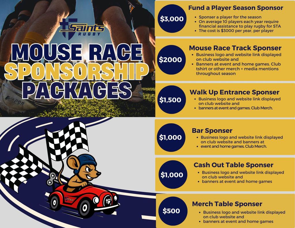 We greatly appreciate the support of our Team Sponsors and Mouse Race Sponsors who make our season possible. We encourage our Saints Rugby family to support these great local businesses!